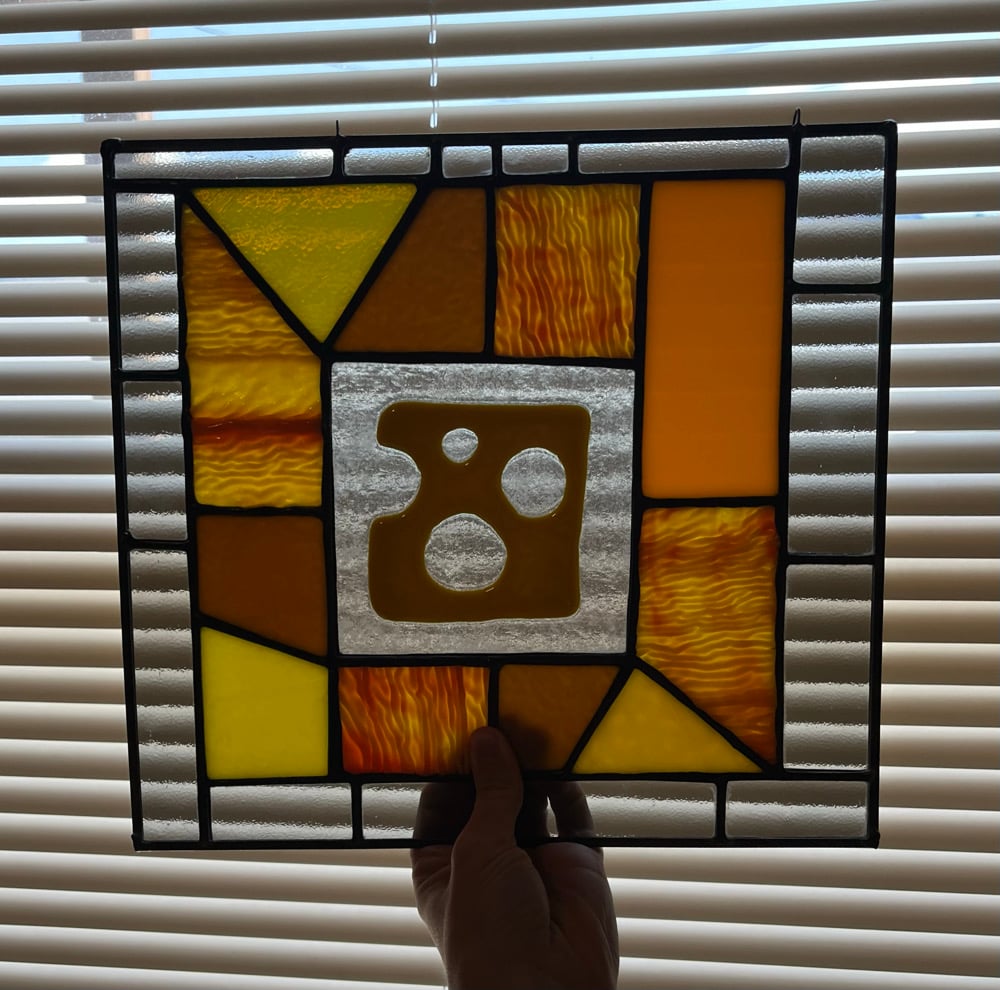 The cheese slice is fused and kiln fired and surrounded by a colorful border of yellow and orange glass of different shapes and textures.