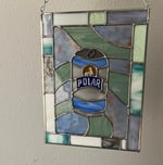 All can details are hand fused and kiln fired. Panel measures roughly 11.25 inches by 8.25 inches and is framed in zinc. Comes with chain attached for hanging.